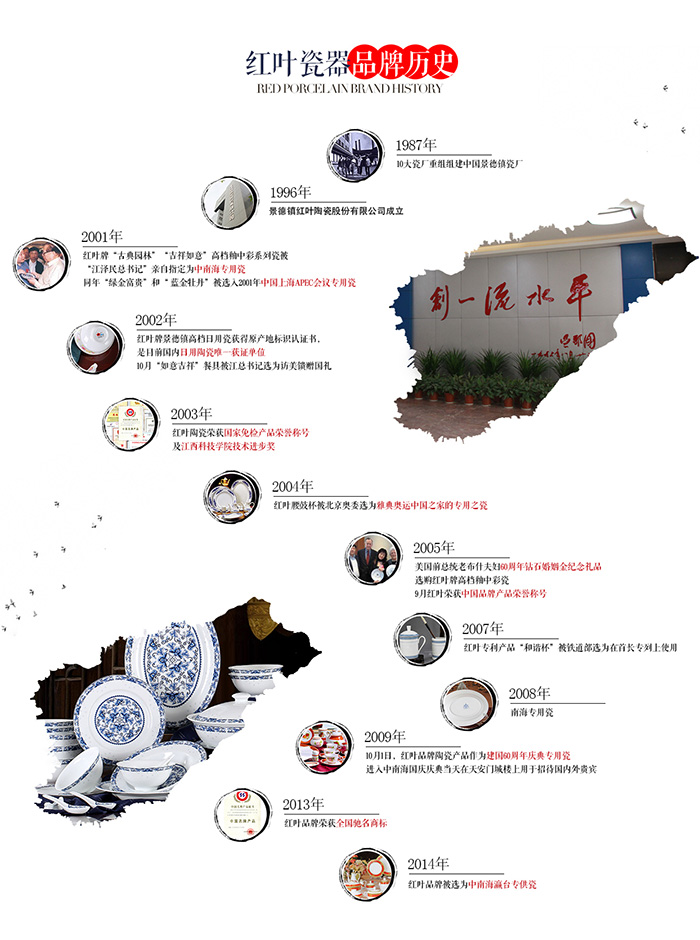 公司于2002年通過ISO9001:2000國際質(zhì)量體系認(rèn)證,為拓展國際市場奠定基礎(chǔ)。"紅葉"牌高檔細(xì)瓷取得了國家質(zhì)量監(jiān)督檢驗(yàn)檢疫總局頒發(fā)的原產(chǎn)地標(biāo)記注冊證書。