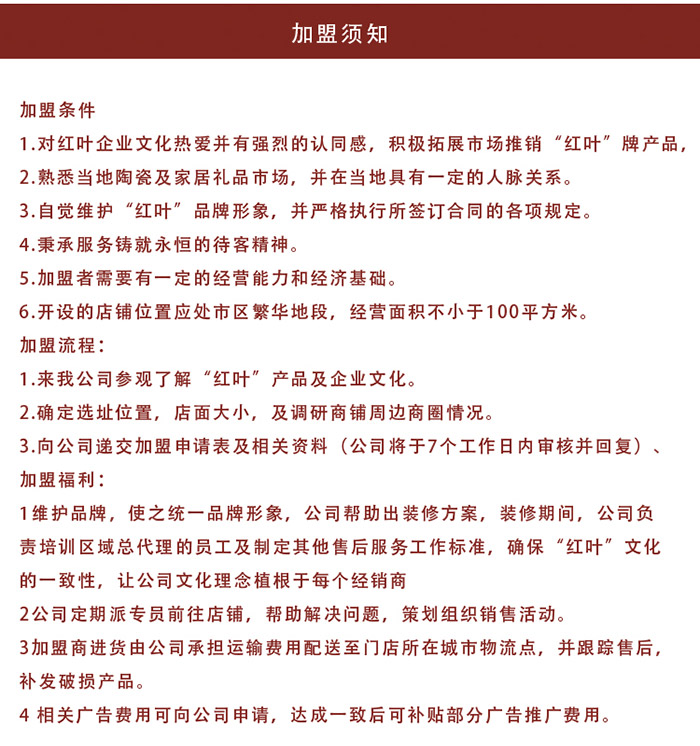 良禽擇木而棲,我們熱忱歡迎各界熱愛紅葉陶瓷且備具一定經(jīng)濟(jì)實(shí)力的有志之士,加盟“紅葉”,與我們一起共同創(chuàng)造景德鎮(zhèn)紅葉陶瓷股份有限公司的美好明天。