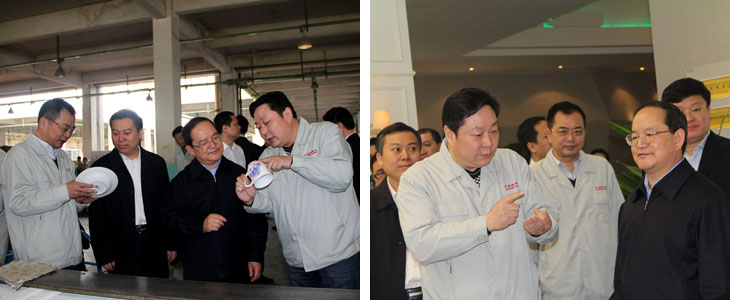 2012年4月6日江西省人民政府省長鹿心社一行在市委書記鄧保生、市長劉昌林等省市領導的陪同下來我司視察工作,鹿心社省長一行參觀了工廠生產車間、國瓷館,詳細了解了公司的生產運營情 況并對公司產品贊不絕口。視察期間,鹿心社省長對公司給予了高度評價:“你們公司為景德鎮(zhèn)爭了光,為江西爭了光,為國家爭了光。"并希望公司能牢牢抓住精品路線,抓住高端市場,搞活機制,繼續(xù)做的更大更好。