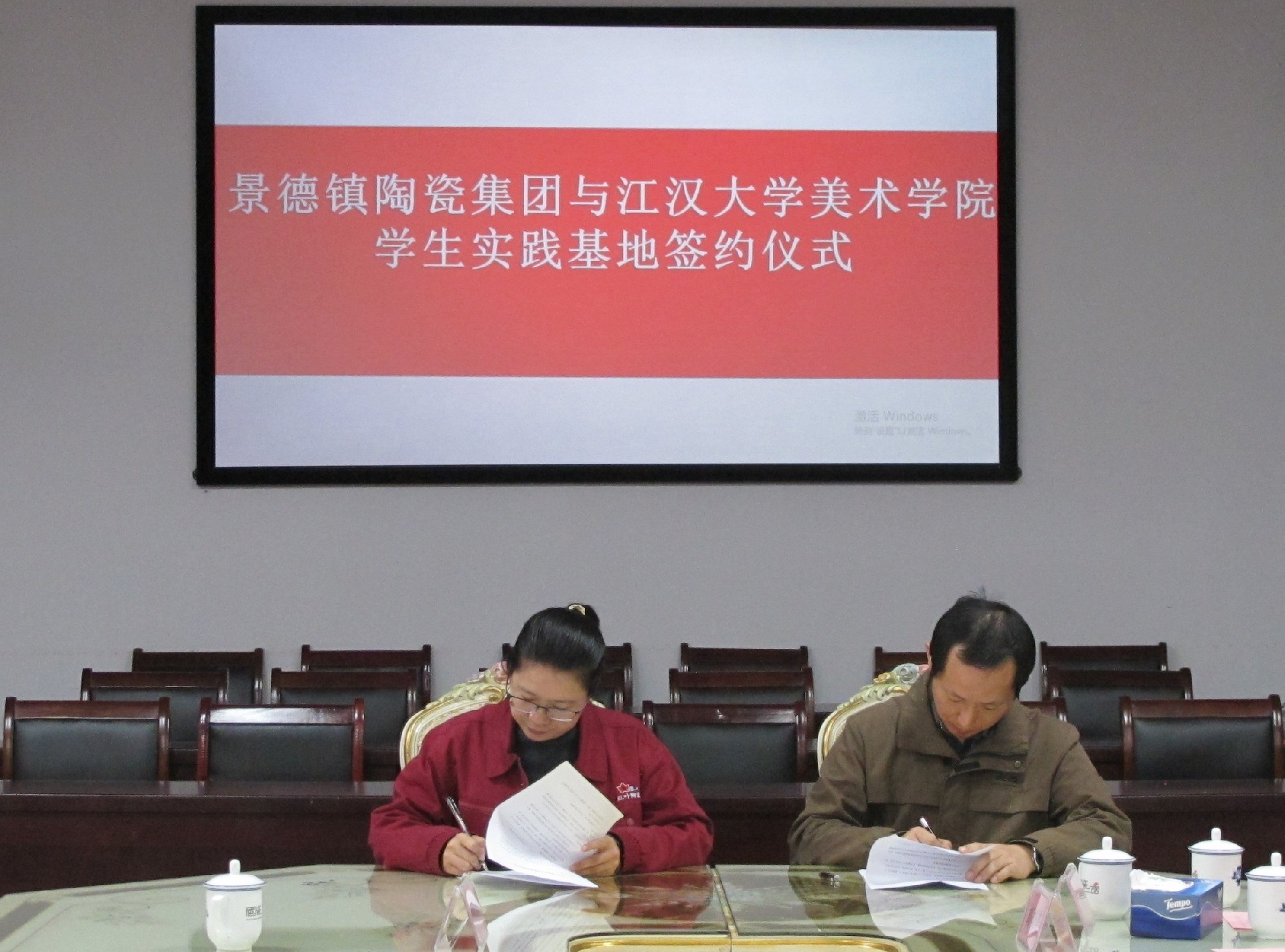 會(huì)上,舉行了江漢大學(xué)美術(shù)學(xué)院與景陶集團(tuán)“共建學(xué)生實(shí)踐基地”簽約授牌儀式。集團(tuán)人力資源部部長(zhǎng)薛景玉、江漢大學(xué)美術(shù)學(xué)院副院長(zhǎng)馬杰分別代表雙方初步簽訂了《校外實(shí)習(xí)基地建設(shè)協(xié)議書》,江漢大學(xué)美術(shù)學(xué)院副書記楊緒軍代表江大美院捐贈(zèng)《江漢大學(xué)美術(shù)學(xué)院畢業(yè)作品集》等書籍。